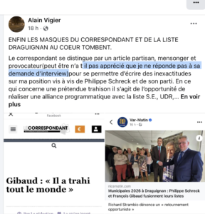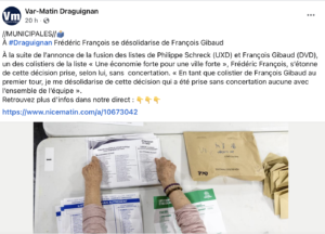 Var Matin en a publié un extrait dans la journée, signé par Fréderic François. Ce retraité ne passe pas par mille chemins pour exprimer son malaise. Il nous a confié au téléphone qu’il est Dracénois et qu’il « connait du monde dans la ville « et qu’il ne souhaite pas « que son image soit associée au Rassemblement National ».